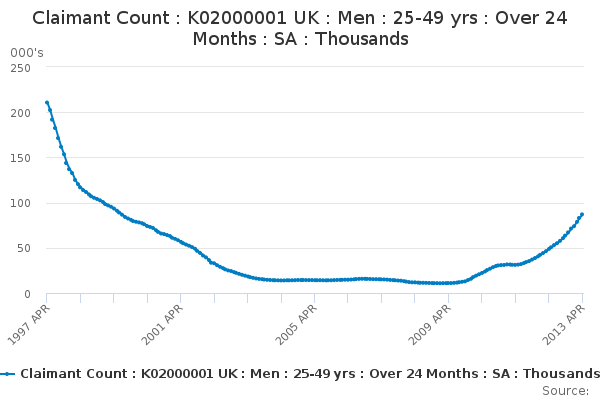 Download this time seriesClaimant Count : K02000001 UK : Men : 25-49 yrs : Over 24 Months : SA : Thousands