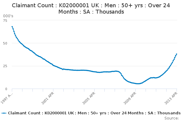 Download this time seriesClaimant Count : K02000001 UK : Men : 50+ yrs : Over 24 Months : SA : Thousands