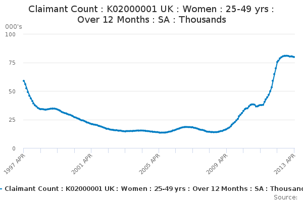 Download this time seriesClaimant Count : K02000001 UK : Women : 25-49 yrs : Over 12 Months : SA : Thousands