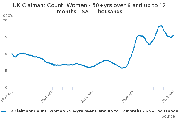 Download this time seriesUK Claimant Count: Women - 50+yrs over 6 and up to 12 months - SA - Thousands