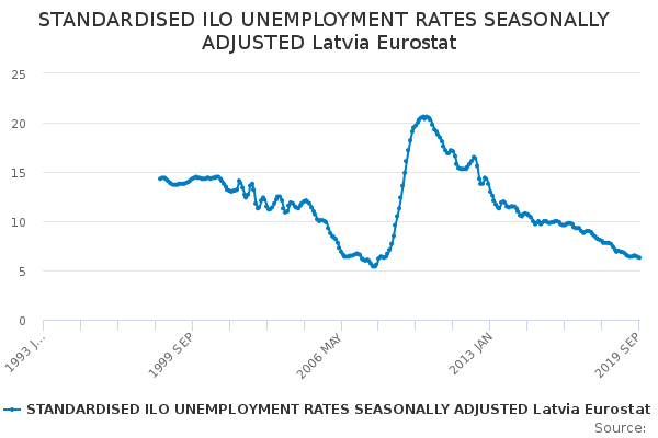 Download this time seriesSTANDARDISED ILO UNEMPLOYMENT RATES SEASONALLY ADJUSTED Latvia Eurostat