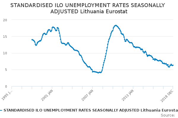 Download this time seriesSTANDARDISED ILO UNEMPLOYMENT RATES SEASONALLY ADJUSTED Lithuania Eurostat