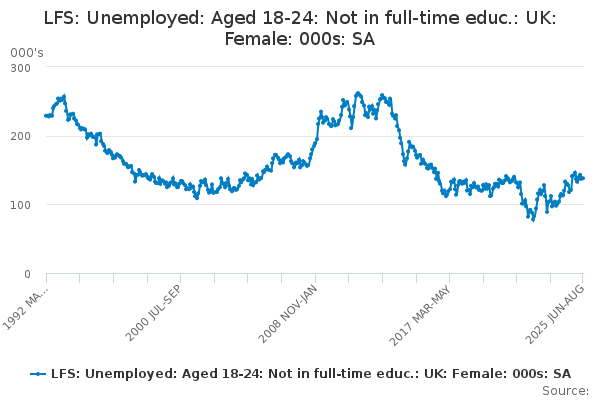 Download this time seriesLFS: Unemployed: Aged 18-24: Not in full-time educ.: UK: Female: 000s: SA