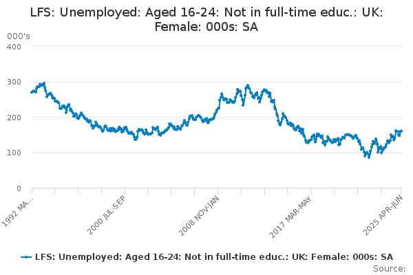 Download this time seriesLFS: Unemployed: Aged 16-24: Not in full-time educ.: UK: Female: 000s: SA