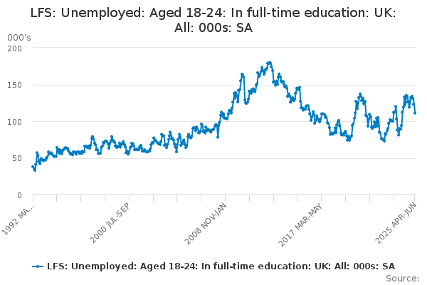 Download this time seriesLFS: Unemployed: Aged 18-24: In full-time education: UK: All: 000s: SA