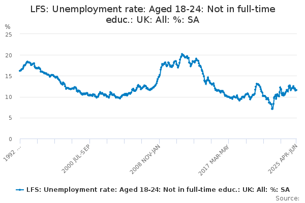 Download this time seriesLFS: Unemployment rate: Aged 18-24: Not in full-time educ.: UK: All: %: SA