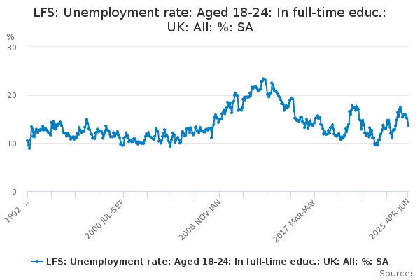 Download this time seriesLFS: Unemployment rate: Aged 18-24: In full-time educ.: UK: All: %: SA