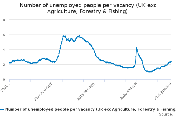 Download this time seriesNumber of unemployed people per vacancy (UK exc Agriculture, Forestry & Fishing)
