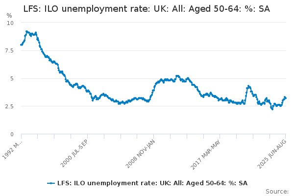 Download this time seriesLFS: ILO unemployment rate: UK: All: Aged 50-64: %: SA