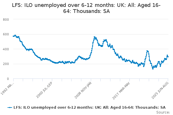Download this time seriesLFS: ILO unemployed over 6-12 months: UK: All: Aged 16-64: Thousands: SA