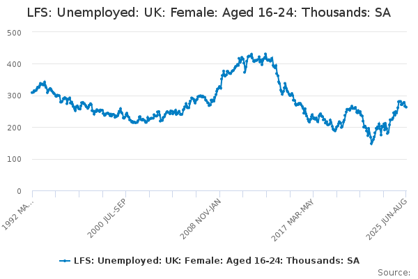 Download this time seriesLFS: Unemployed: UK: Female: Aged 16-24: Thousands: SA