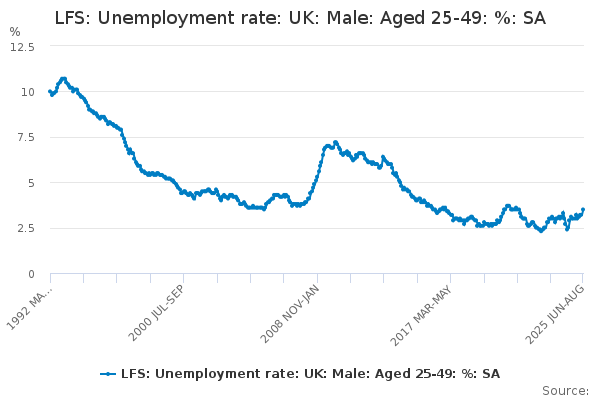 Download this time seriesLFS: Unemployment rate: UK: Male: Aged 25-49: %: SA