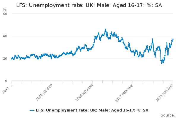 Download this time seriesLFS: Unemployment rate: UK: Male: Aged 16-17: %: SA