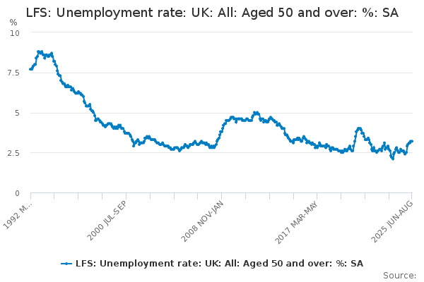 Download this time seriesLFS: Unemployment rate: UK: All: Aged 50 and over: %: SA