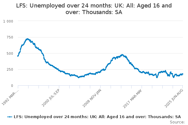 Download this time seriesLFS: Unemployed over 24 months: UK: All: Aged 16 and over: Thousands: SA