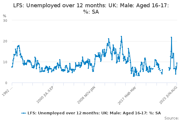 Download this time seriesLFS: Unemployed over 12 months: UK: Male: Aged 16-17: %: SA