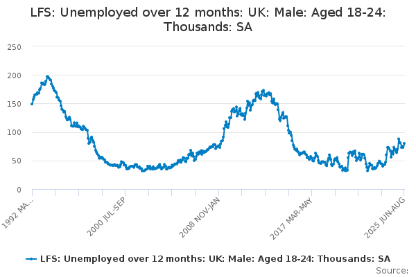 Download this time seriesLFS: Unemployed over 12 months: UK: Male: Aged 18-24: Thousands: SA