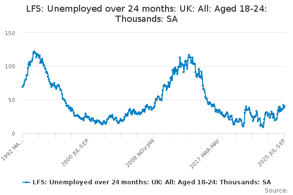 Download this time seriesLFS: Unemployed over 24 months: UK: All: Aged 18-24: Thousands: SA