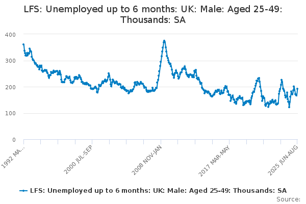 Download this time seriesLFS: Unemployed up to 6 months: UK: Male: Aged 25-49: Thousands: SA