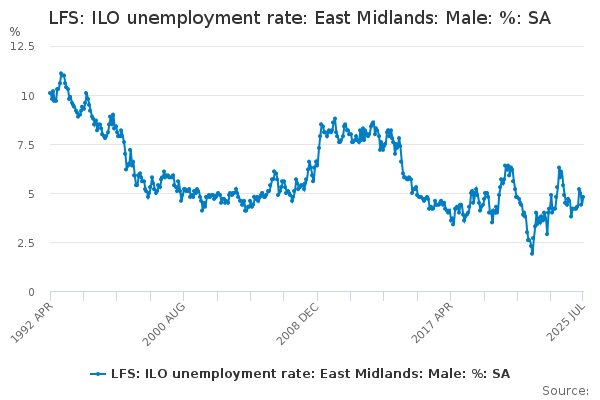 Download this time seriesLFS: ILO unemployment rate: East Midlands: Male: %: SA