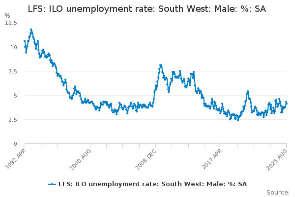 Download this time seriesLFS: ILO unemployment rate: South West: Male: %: SA
