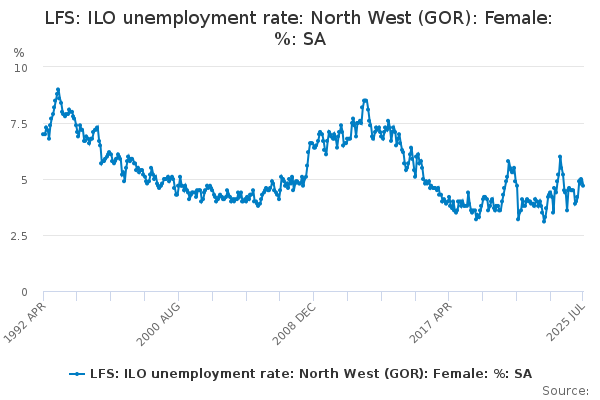 Download this time seriesLFS: ILO unemployment rate: North West (GOR): Female: %: SA