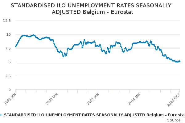 Download this time seriesSTANDARDISED ILO UNEMPLOYMENT RATES SEASONALLY ADJUSTED Belgium - Eurostat