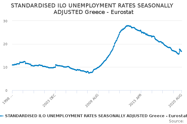 Download this time seriesSTANDARDISED ILO UNEMPLOYMENT RATES SEASONALLY ADJUSTED Greece - Eurostat