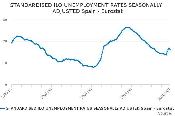 Download this time seriesSTANDARDISED ILO UNEMPLOYMENT RATES SEASONALLY ADJUSTED Spain - Eurostat