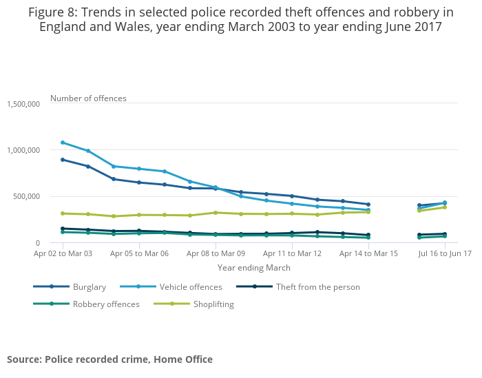 Image .csv .xlsSince the mid-1990s, both the CSEW and police recorded crime have shown long-term reductions in most categories of theft. However, police recorded theft increased by 11% in the year ending June 2017 compared with the previous year and continues the recent upward rise seen in the last two years. This includes rises in all main categories of theft, including burglary (6%), vehicle-related theft offences (17%), theft from the person (11%) and shoplifting (11%); of which the latter is not covered by the CSEW.