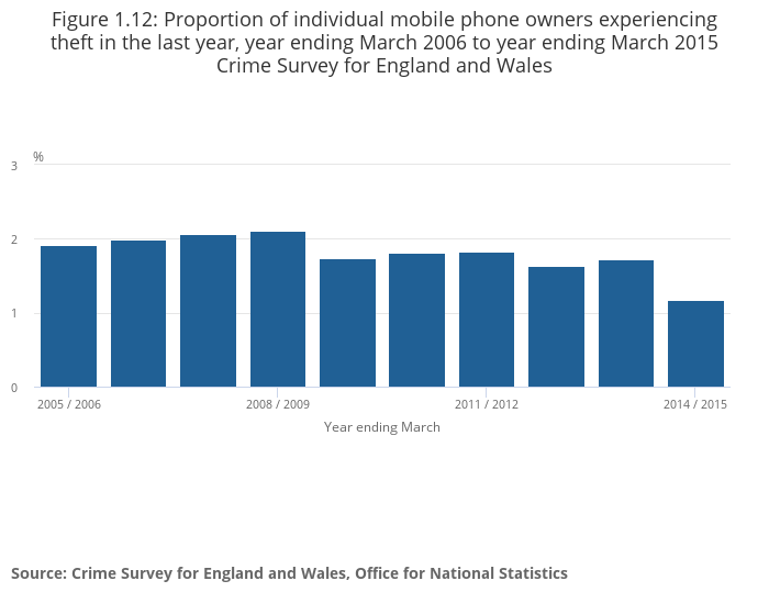 According to the 2014/15 CSEW, 1.2% (equivalent to 538,000 people) of mobile phone owners experienced a theft in the previous year a decrease from 1.7% in 2013/14.
