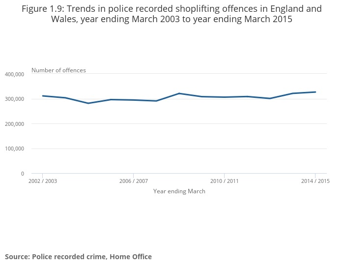 shoplifting6 accounted for 11% of property crime in 2014/15 compared to 6% in 2002/03, although the number of shoplifting offences recorded by the police remained roughly the same (326,440 in 2014/15 compared with 310,881 in 2002/03)