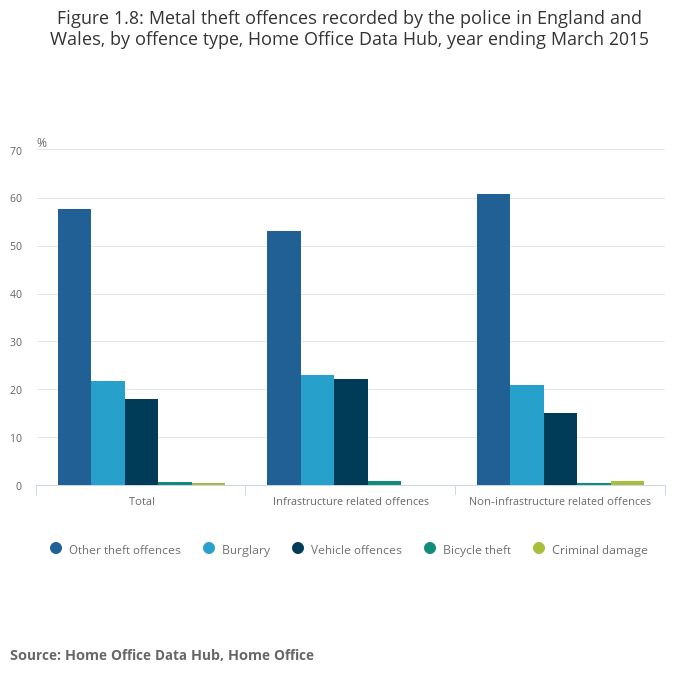 The value of items is an important factor in driving trends in theft. Metal theft provides a good example of this, with increases seen between 2009/10 and 2011/12, which corresponded with a spike in metal commodity prices. However, the most recent metal theft data from the police show that levels have continued to fall, with the 27,512 offences recorded during 2014/15 representing a decrease of 35% compared with 2013/14. These falls are also likely to reflect legislation introduced to tackle metal theft.