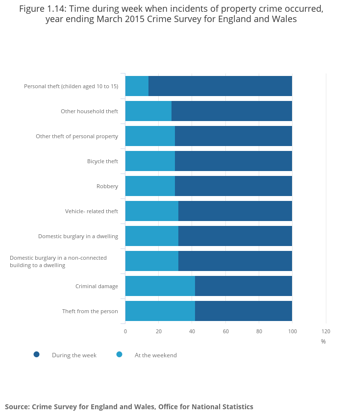 Figure 1.14: Time during week when incidents of property crime occurred, year ending March 2015 Crime Survey for England and Wales