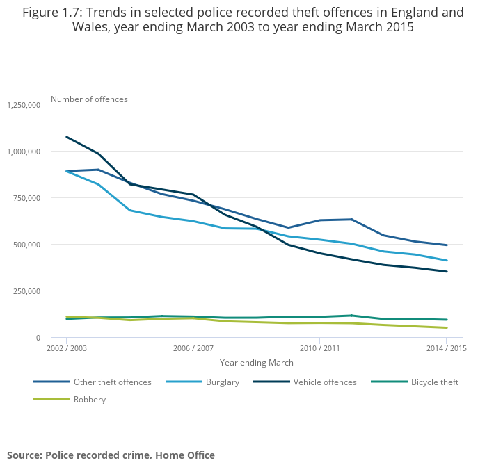 Similar to the CSEW police recorded vehicle offences and burglary have shown the largest decreases in volume over the last decade. Between the years 2002/03 and 2014/15; vehicle offences were down by 67% (to 351,458 offences) and burglary down by 54% (to 411,425 offences) as seen in Figure 1.7. These decreases have been the main drivers on the overall downward trend in property crime.