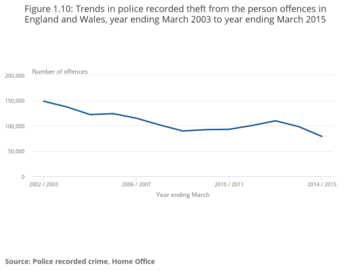the trend in theft from the person has remained relatively flat since the mid-1990s. Estimates of the volume of theft from the person offences have shown a slight downward trend over the period from the late 1990s. In the 2014/15 survey a fall of around 21% was seen compared to the previous year. This is consistent with the change seen in police recorded crime for this offence type and similar to decreases seen in other theft categories such as other theft of personal property