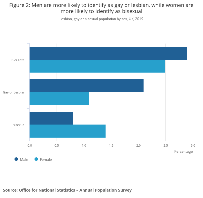 Lesbian, gay or bisexual population by sex, UK, 2019