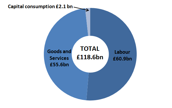 Figure 10 shows that labour expenditure accounts for 51% of total public service healthcare expenditure (£60.9bn) compared to 47% for goods and services expenditure (£55.6 billion) in 2012. Capital consumption accounts for the remaining 2% of the total £118.6 billion.