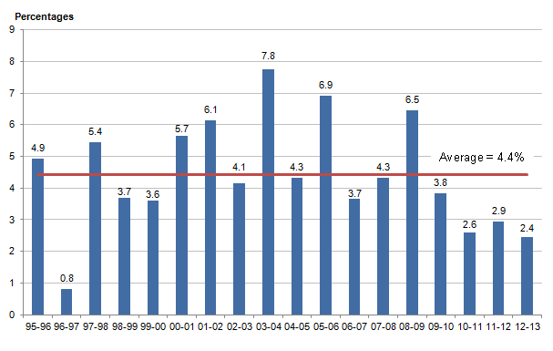 Figure 4: Public service healthcare quantity growth, 1995-96 to 2012-13