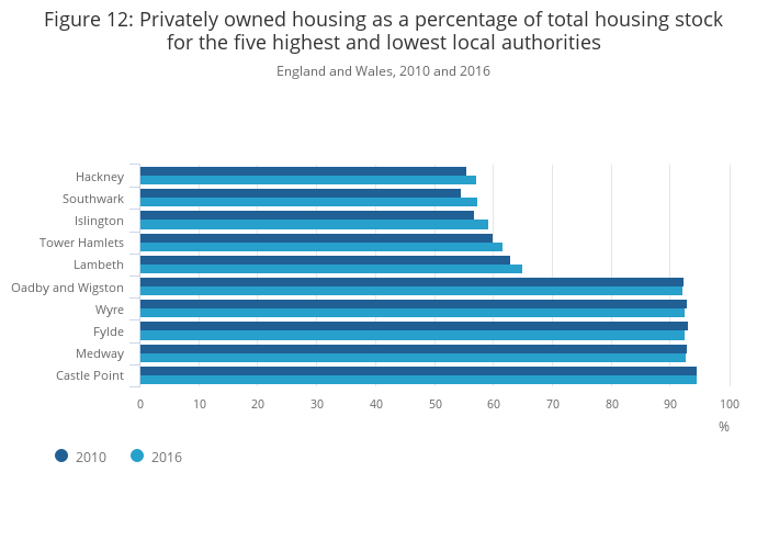 Figure 12 shows privately-owned housing as a percentage of total housing stock for the highest and lowest five local authorities in England and Wales in 2016, comparing 2016 with 2010. The local authority with the lowest percentage of privately-owned housing in 2016 was Hackney in London with 57.1%, an increase of 1.67 percentage points since 2010. The lowest five local authorities for privately-owned housing in 2016 have had an increase of between 1.67 and 2.75 percentage points since 2010.