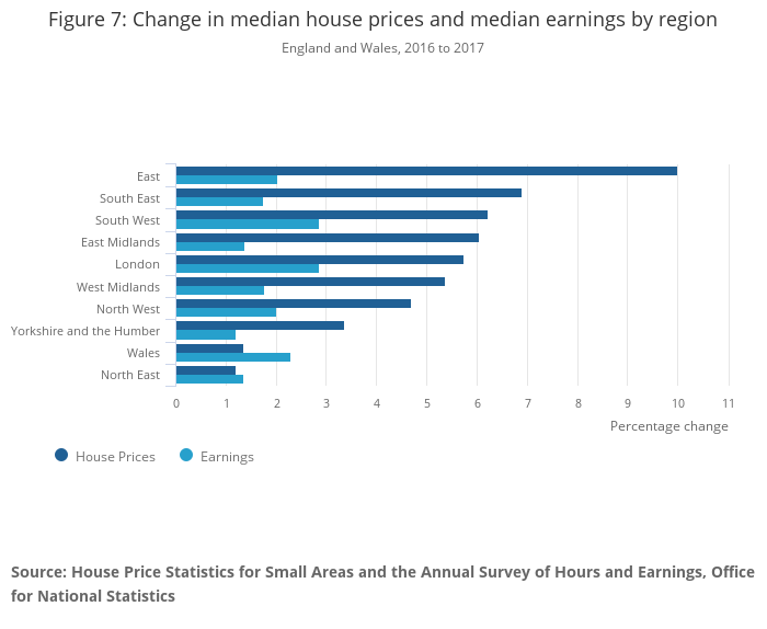 Figure 7 shows the percentage change in house prices and earnings separately for each English region and in Wales between 2016 and 2017. It shows that house prices and earnings increased in all English regions and Wales, but the two regions with the largest increase in house prices (the East (10%) and the South East (6.9%)), were the two regions with the significant differences over the year. This suggests that house prices are driving the significant worsening in affordability.