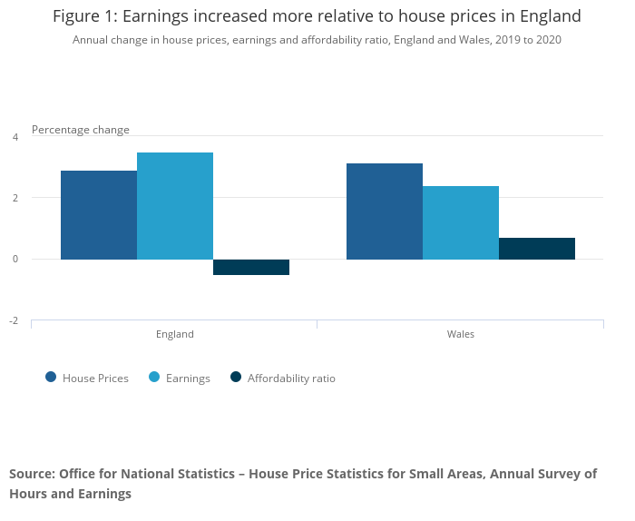 In Wales, the median price paid for properties increased by 3.1% in 2020 compared with 2019, while earnings increased by 2.4%. This suggests affordability slightly worsened in Wales.