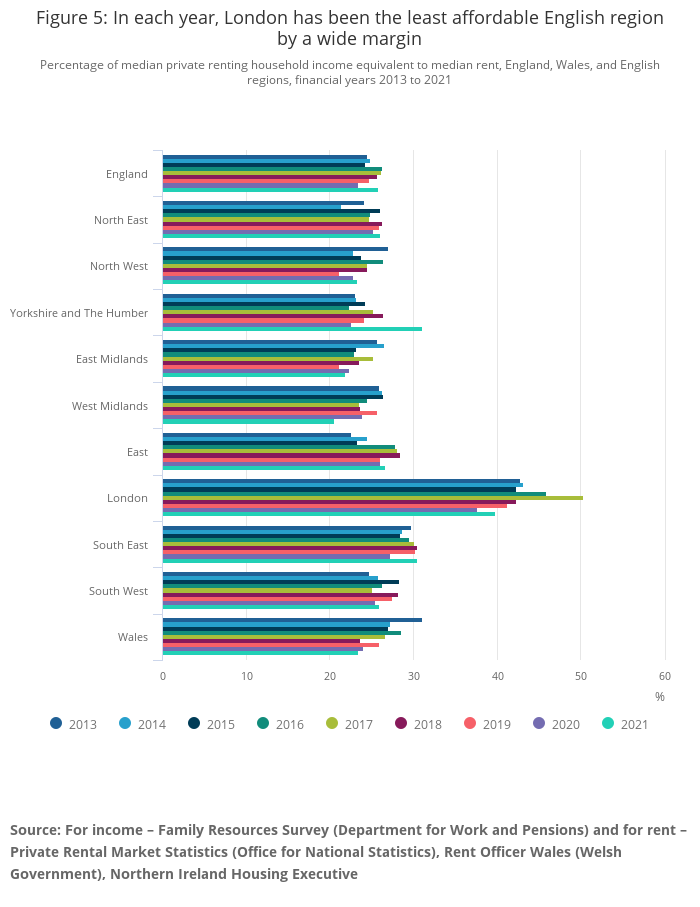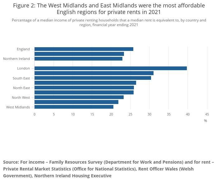 The West Midlands and East Midlands were the most affordable regions with median rents being equivalent to 21% and 22%, respectively, of median income.