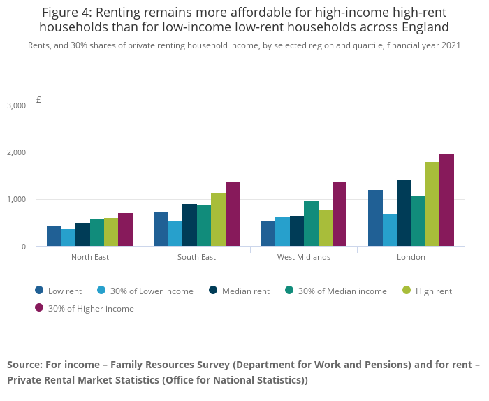 Figure 4: Renting remains more affordable for high-income high-rent households than for low-income low-rent households across England