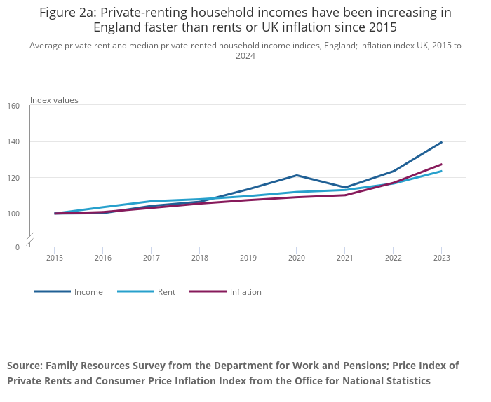 Despite private rents increasing since 2015, and at a faster rate since 2022, incomes of private-renting households in England and Wales have increased at a faster rate, leaving affordability at a broadly similar level in FYE 2023 compared with 2015.