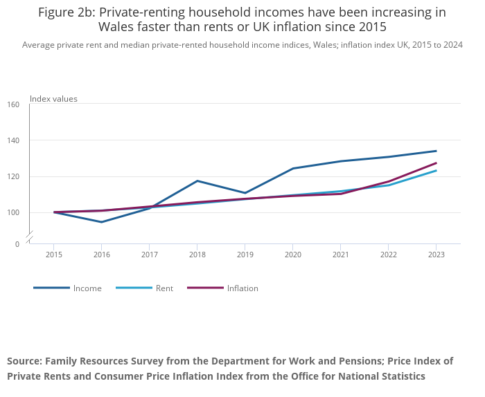 Figure 2b: Private-renting household incomes have been increasing in Wales faster than rents or UK inflation since 2015
