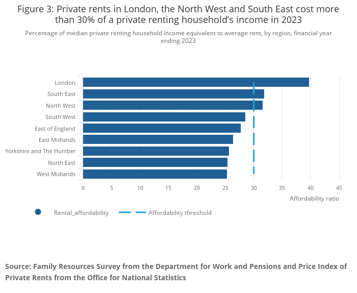 Figure 3: Private rents in London, the North West and South East cost more than 30% of a private renting household’s income in 2023