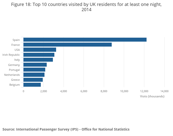Figure 18: Top 10 countries visited by UK residents for at least one night, 2014
