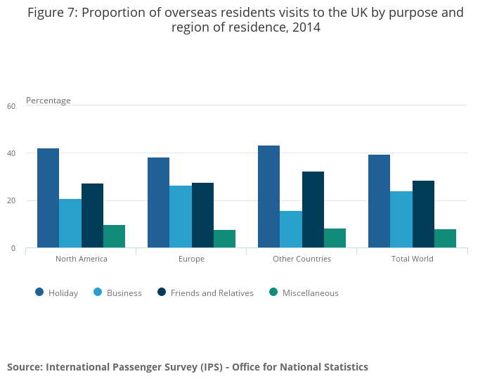 Holidays remain the main reason for visits to the UK, accounting for 13.6 million visits, a rise of 7.2% compared with 2013. Business visits and visits to friends and family both showed a growth of 4.8%