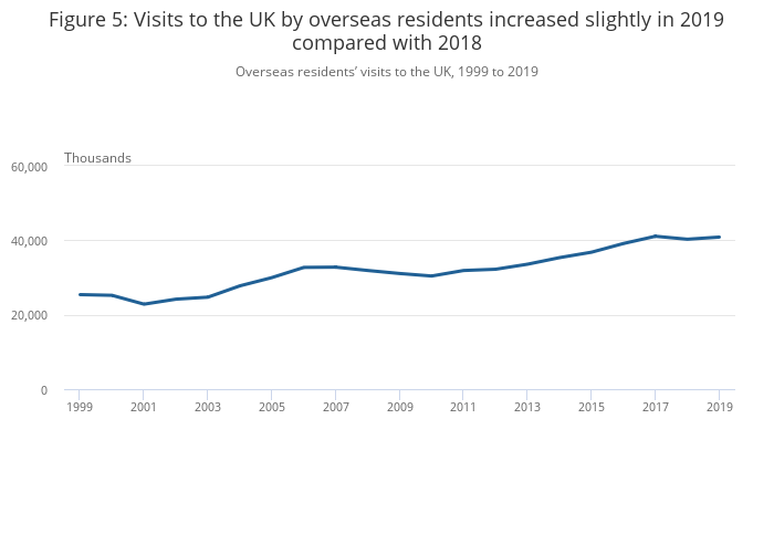 Overseas residents made a total of 40.9 million visits to the UK during 2019 (Figure 5), an increase of 1% compared with 2018 but lower than the peak reached in 2017 (41.1 million visits).